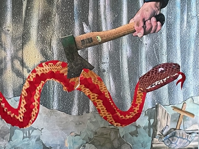 Als een vader? Dan wel een vader, die zijn ondankbare kind een lesje leert door het een kopje kleiner te maken. Met een scherpe bijl hakt hij het ondier in stukken, een kop, een lichaam en een staart. Ze kronkelen nog even door, maar dan het is voorgoed afgelopen.
